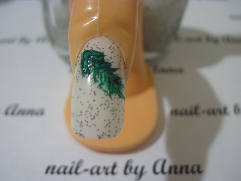 - Красим ногти белым лаком (у меня лак с черными песчинками, напоминающий падающий снег), сушим.