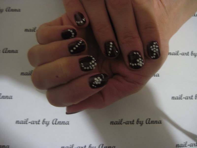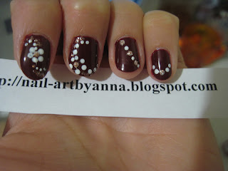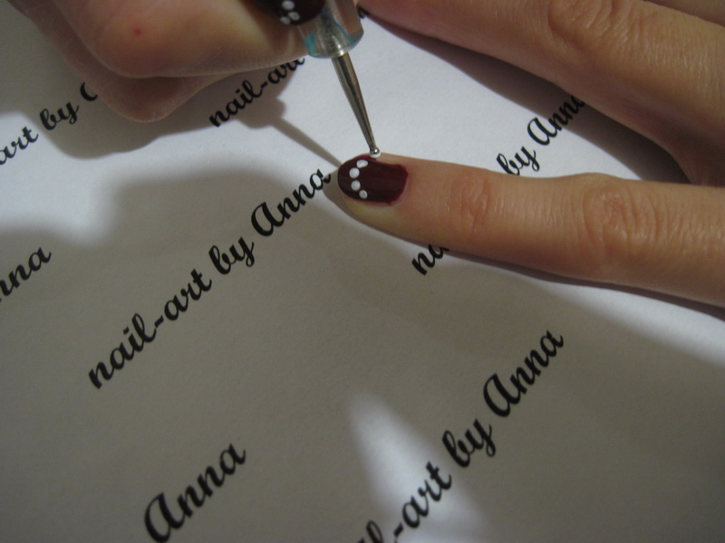 - Аккуратно вмакиваем дотс в белый лак и ставим точки, получаются цветы, ветки. Тут все зависит от вашей фантазии. Экспериментируйте!