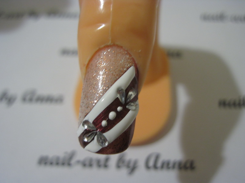 В наступившем 2012 году, как пишут модные журналы, очень актуальны в маникюре серая, коричневая и синяя гаммы, а также все оттенки темно-красного и кирпичного. И сегодня я предложу Вашему вниманию вариант дизайна в коричневом тоне. Материалы: основа и закрепитель, белый, коричневый лак и прозрачный с блестками, стразы.